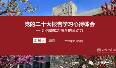 青年教师代表顾苏分享了学习二十大报告的心得。她认为,二十大报告系统回顾总结了新时代十年的伟大变革,科学擘画了未来中国发展的宏伟蓝图,其中突出强调了教育、科技和人才的作用。作为具有鲜明“红色基因”的北外教师,我们应不忘初心、牢记使命,为党育人,为国育才,切实将二十大精神有机融入到教学工作中;发挥自身的学科优势,为构建中国特色的学科、学术体系以及话语体系添砖加瓦,把服务国家作为科研工作的最高追求。她结合个人参与庆祝中德建交50周年《中德大咖谈》节目录制的经历,认为外语教师应力求在大格局下讲好小故事,向世界发出中国声音。