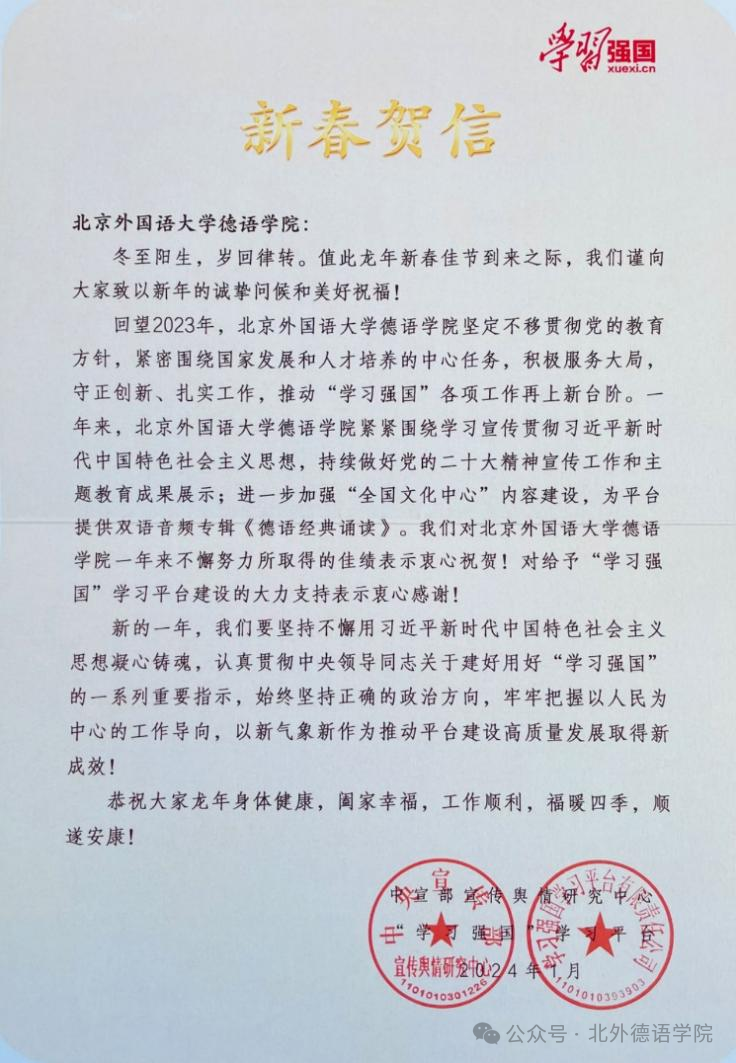 收到由中宣部宣传舆情研究中心与“学习强国”学习平台发来的新春贺信,对学院一直以来不懈努力所取得的佳绩表示祝贺,对其给予“学习强国”学习平台建设的支持表示由衷感谢。