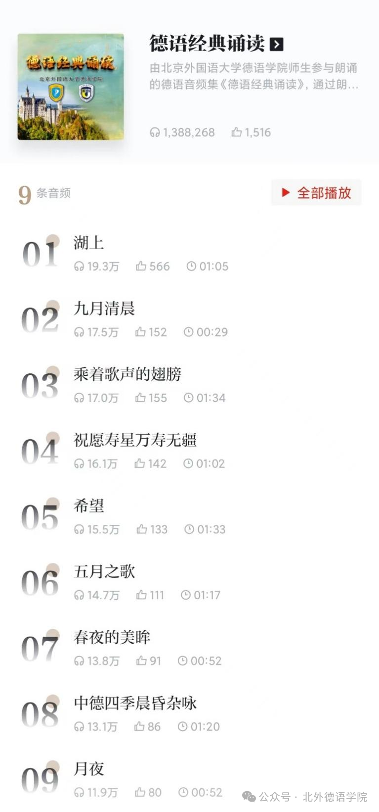 在党总支书记、院长吴江,党总支常务副书记李勇,党总支委员、副院长张晓玲、寇蔻,教职工党支部宣传委员孙嘉惠以及辅导员黄唯城的精心组织下,开展了本科生德语经典诗歌朗诵活动并将双语音频专辑《德语经典诵读》成果发表于学习强国平台。《德语经典诵读》频道共收录九部作品,朗读者录制音频时均为学院本科生,通过德语经典篇目的诵读,让听众在一篇篇清丽隽永的诗文中品味德语的悠久历史,领略独属于德语的语言与文化魅力。截至近日,此频道累计收获近140万播放量与上千条点赞量。
