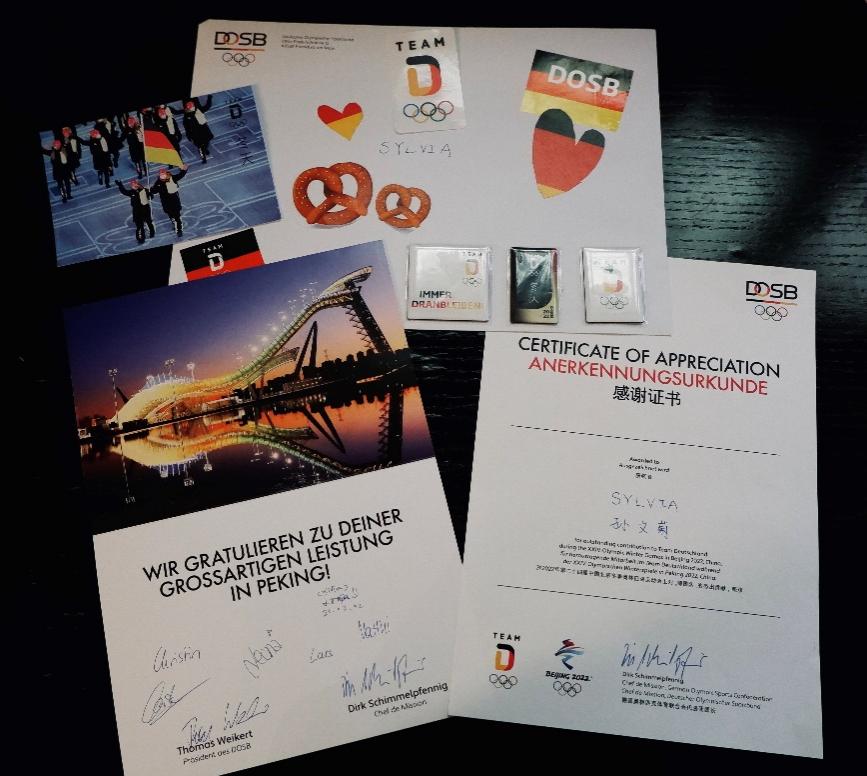 五位同学充分发挥北外人、德语人的专业优势,一方面高效协作,圆满地帮助德国代表团工作人员和运动员们解决了在冬奥期间遇到的各种难题,另一方面她们也牢记“讲好中国故事、传播中国声音”的光荣使命,在工作之余积极向德国代表团成员介绍中华文化,展现中国青年志愿者温暖热情、认真负责的形象,促进中德两国友好交流。五位同学的工作获得德国代表团的高度认可与充分肯定,冬奥会结束之际,她们均收到了来自德国代表团团长迪尔克·席梅尔普芬尼希(Dirk Schimmelpfennig)的感谢证书和表达谢意的珍贵礼物。