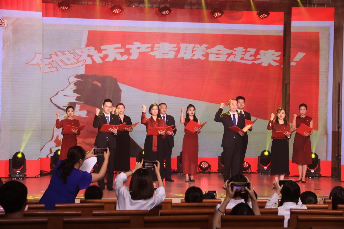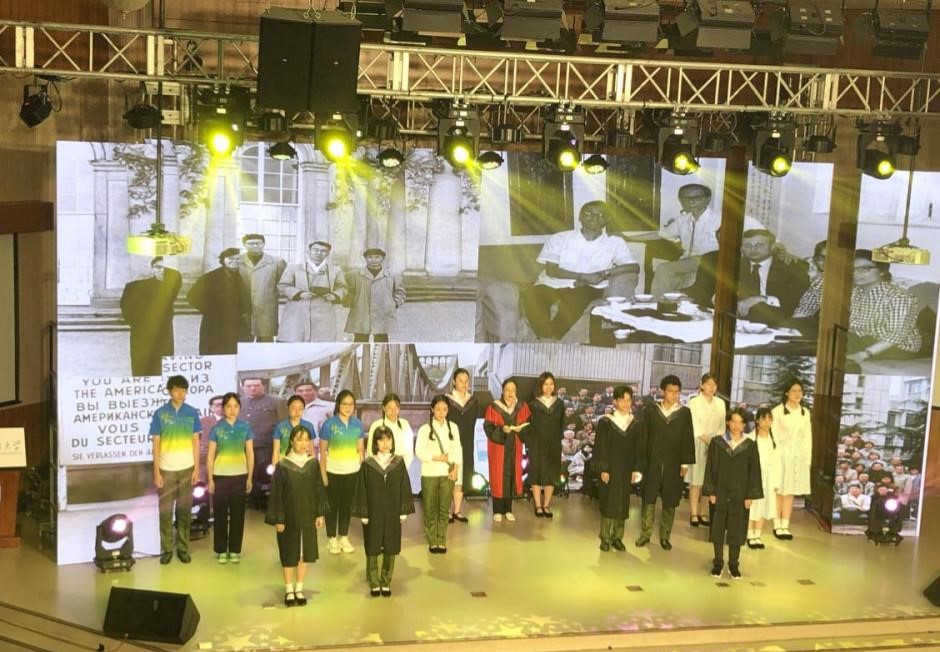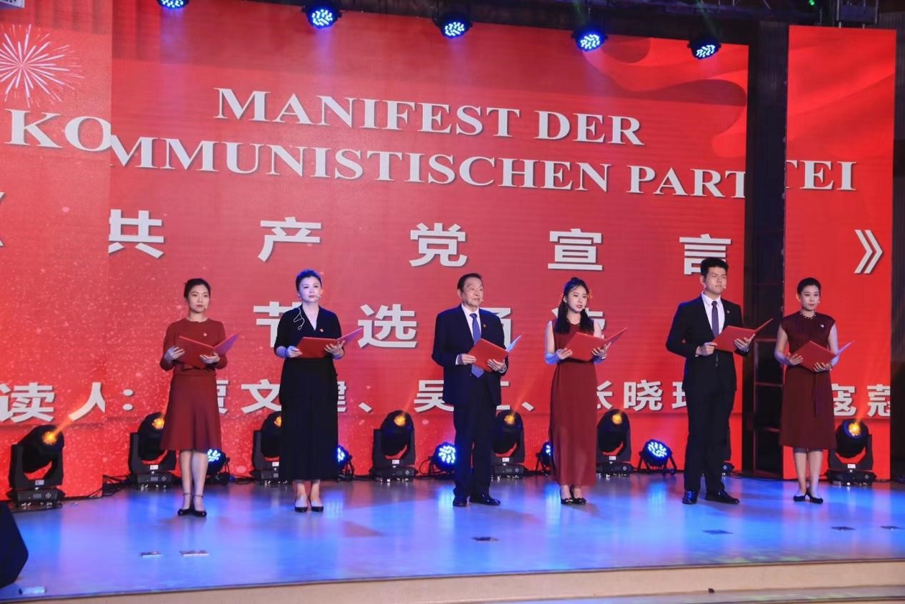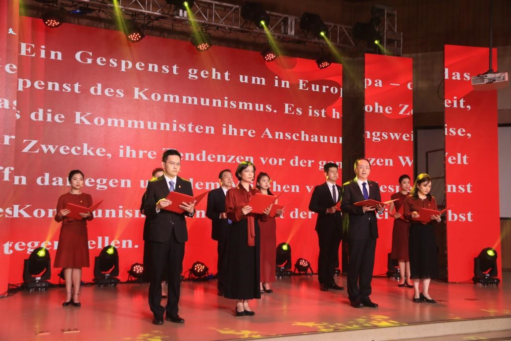 教师关海霞、张晓玲、孙嘉惠、寇蔻,以及焦冠群、赵紫萌、萧律语等同学,用中德双语集体朗诵了歌德的诗歌《祝愿寿星万寿无疆》、海涅的诗歌《乘着歌声的翅膀》、席勒的诗歌《希望》以及马克思和恩格斯的经典名篇《共产党宣言》(节选),不仅向观众展示了原汁原味德语诗歌的魅力,送上了对中国共产党以及母校华诞的美好祝福,同时表达了坚定的共产主义理想信念。