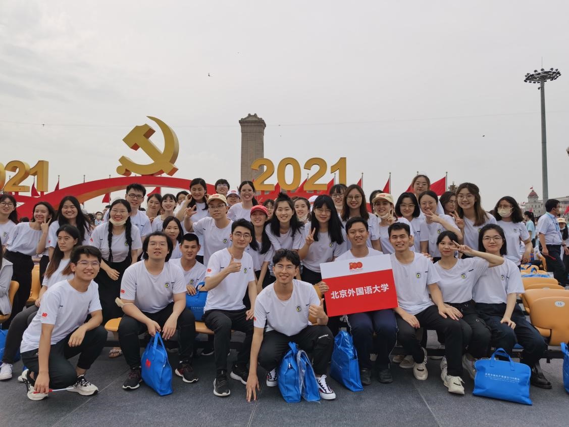 学生代表本科生付润涵,研究生潘灵玲、周顾盈、徐泽茗与北外其他院系学生代表共同前往天安门广场参加庆祝大会。