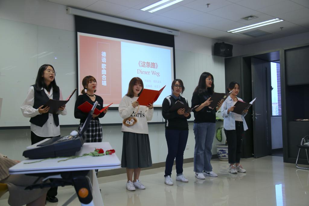 诗诵会中还穿插了学生们精心准备的中德文歌曲表演。在雷婉珞同学的独唱德文歌曲《小小少年》以及周杰湄、周如安、李唯伊同学合唱的中文歌曲《同桌的你》的悠扬歌声中,大家共同追忆了无忧无虑的少年时光和美丽青涩的青春年华。