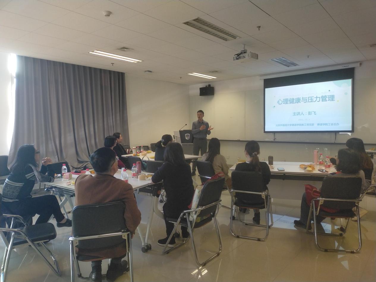工会于12月1日13点至15点,在国际大厦1053会议室,联合举办教师“心理健康与压力管理”团体活动。北外心理咨询中心咨询师、国家二级心理咨询师彭飞为老师们讲授维护心理健康和缓解压力的知识。