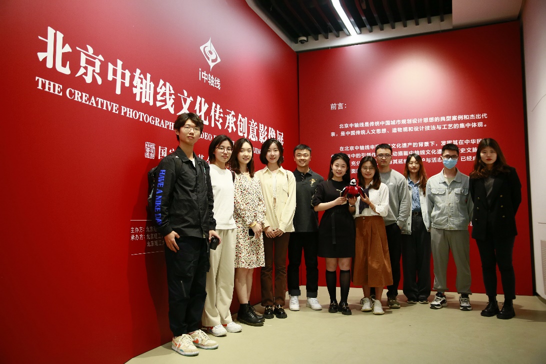 (图为《跨越中轴线》项目组部分成员于“北京中轴线文化传承创意影像展”实地调研,左二至左六依次为:袁紫云、肖政谕、王颖、曹涵、黄徐洋)