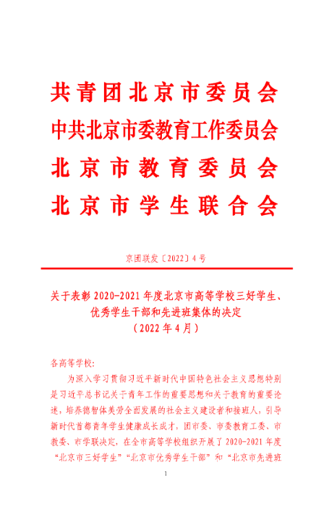近日,团市委、市委教育工委、市教委、市学联在全市高等学校组织开展了2020-2021年度“北京市三好学生”的评选工作。通过基层民主评议推荐,学校团委审核、学校党委同意并公示,团市委、市教委评审等环节,共青团北京市委员会、中共北京市委教育工作委员会、北京市教育委员会、北京市学生联合会发布《关于表彰2020-2021年度北京市高等学校三好学生、优秀学生干部和先进班集体的决定》。