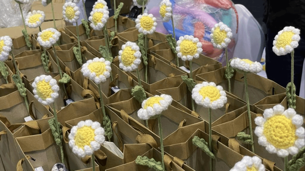 为新生准备的开学礼物,灵感来源于北京冬奥会颁奖花束“绒耀之花”的编织小雏菊,象征着新生,承载着学院对新生美好的祝愿,希望各位新生能在欧美性爱