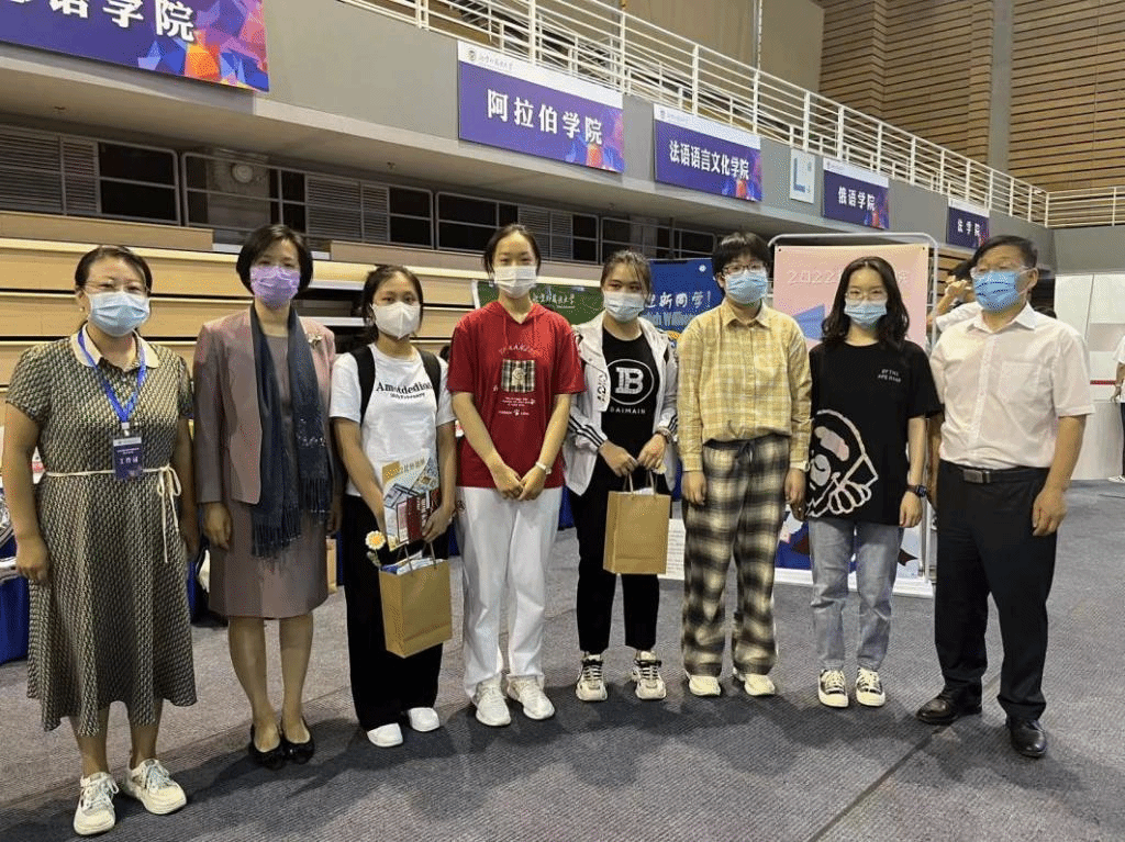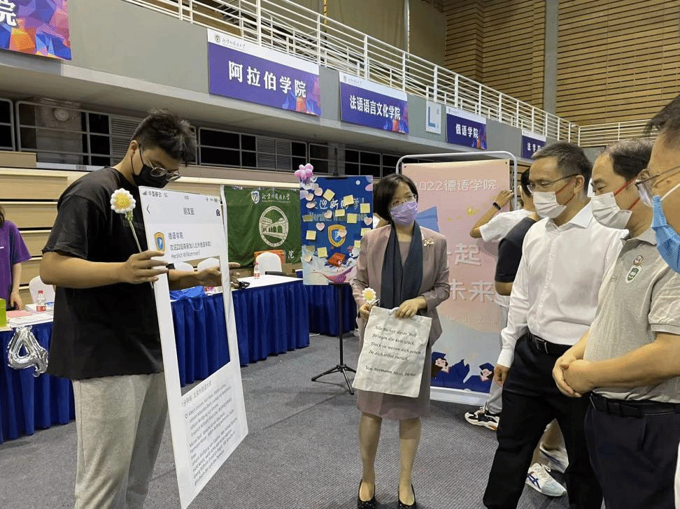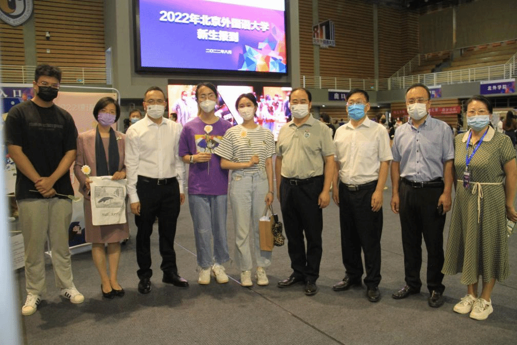 党总支书记常秀鹏,党总支副书记、院长吴江和辅导员张春霞、张婧、黄唯城给校领导展示了迎新处的布置与新生礼品,之后校领导与大家一起亲切合影。