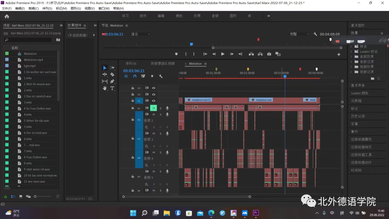 举办的传统赛事,今年恰逢中德建交50周年,所以本届大赛备受瞩目。虽然我们离“主办方”很近,但因为参赛学校众多,再加上此前个别队员失败的参赛经历,我们也面临了很大的压力。在学院老师们的耐心鼓励下,我们慢慢燃起了斗志。从组队、选择影片到配音、剪辑,再到决赛的即兴配音,我们在参赛的过程中不断学习,不断提高。队长郭沈嘉乐经常对大家说:“世上没有什么能信手拈来,我们必须非常努力,才能看起来毫不费力。”