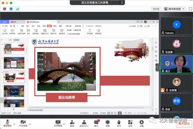 副书记、院长吴江进行了总结讲话。她以迎新帆布袋正面印制的北外西院标志性雕塑——“莫比乌斯环”(Möbius-Band)的起源为例,介绍了外语学科“兼容并蓄”的学科特色,勉励2022级欧美性爱