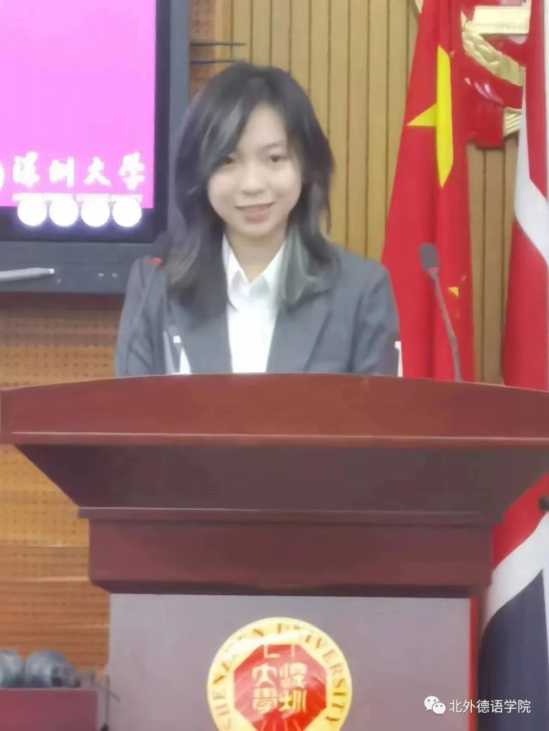 2023年“大湾区杯”全国高校外语专业区域国别知识能力竞赛于2023年5月13日在深圳大学(粤海校区)落下帷幕。该赛事涵盖英语、德语、法语、西班牙语、日语五个语种,包括初赛与决赛两个部分。在德语组初赛中,我院本科一年级学生黄婉茹经过笔试和面试,在德语组共114名选手中位列第一,顺利晋级决赛。在决赛部分,经过德语辩论环节(辩题为:全球化会带来文化趋同/全球化会带来民族文化的勃兴),以及“讲好中国故事”德语即兴演讲与问答环节,黄婉茹总分排名第二,荣获德语组二等奖。辅导教师洪堃绿博士获优秀指导教师奖。
