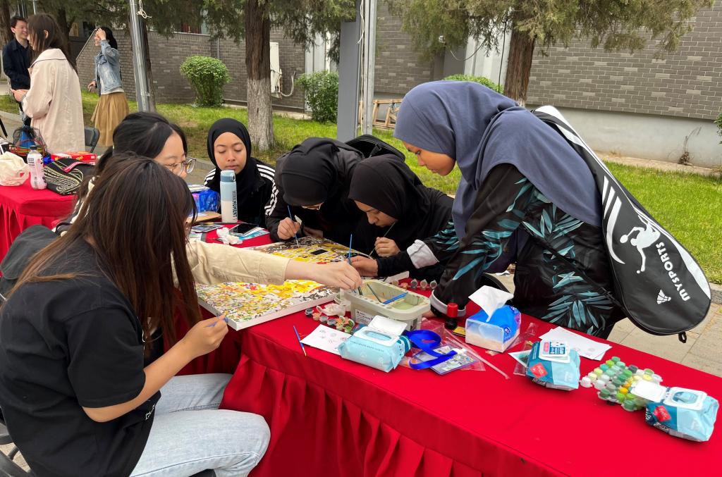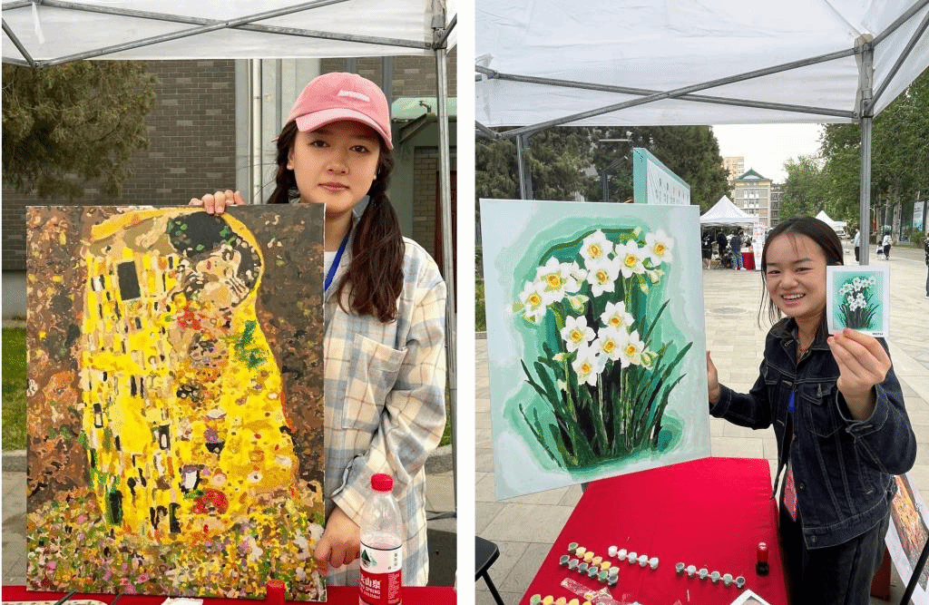 研究生会学术文体部的展台吸引了不少同学,还包括许多外国留学生。在这儿,可以和大家一起绘制一束惟妙惟肖的水仙花,或临摹奥地利画家克利姆特(Gustav Klimt)的著名代表画作,或是亲手DIY一幅涂鸦,画下今日心情,将这份珍贵的记忆留存于纸上。