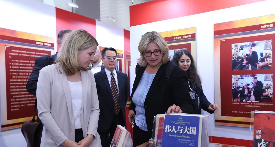 图书馆藏有诸多施密特著作及中译本后表示非常感动。代表团全体成员在书籍前停下脚步,认真翻阅,并对北外德语学科点在人才培养领域做出的杰出贡献表示赞赏。