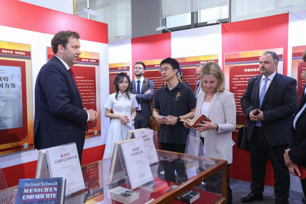 。克林贝尔一行在北外访问期间参观了新近复展的纪念中德建交五十周年主题展“施密特与中国”。主题展通过介绍已故德国前总理、社民党政治家赫尔穆特·施密特(Helmut Schmidt)的生平与中国观,回顾了他为助力中德关系行稳致远做出的卓越贡献。