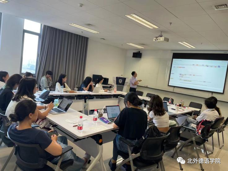 在报告的第三部分,张斌介绍了认知和用法导向的构式语法观对德语教学的启示,其中重点讲解了Herbst(2016)提出的Pedagogical Construction Grammar中的七个实操原则。同时他还建议,德语教学者在实际教学中通过语境将词汇、语法以“打包”的形式呈现给学生,以更好提升德语学习者的学习动力以及语法、语义和语用意识。最后,张斌结合自己的实际经历提出了两个问题:我们究竟需要什么样的语法和语法观?语言使用者的身份认同问题与语法规范的互动应是怎样的?这些问题引起了在座师生的思考和热烈讨论。