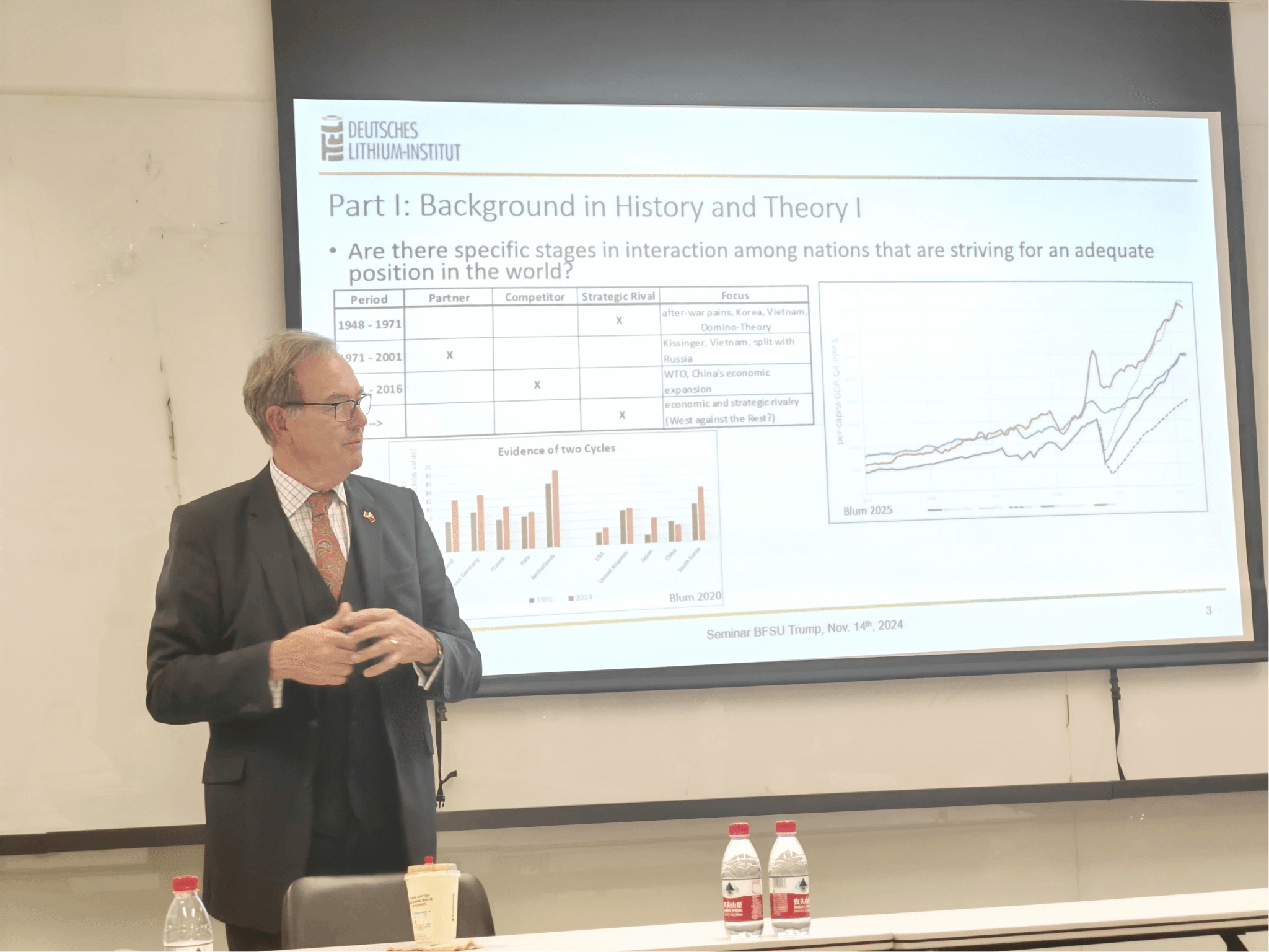 2024年11月14日下午,德国哈勒-维腾贝格大学法学与经济学院讲席教授、欧美性爱 客座教授卜玉洗(Ulrich Blum)应邀到北外欧美性爱 作了题为“经济战和特朗普:来自欧洲的中国视角”的专题讲座。此次讲座由经济教研室主任徐四季副教授主持。