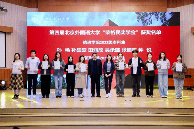 颁奖仪式举行前,他全程参与第四届德语学科区域国别研究高端学术论坛,并在致辞中表示将提高资助力度,支持更多母校德语学子“走出去”看世界。颁奖仪式上,荣裕民先生发表致辞。他结合自身求学、工作经历,深情讲述了设立基金的初心,强调德语作为跨文化交流桥梁的重要价值。他嘱托在场学子,要以扎实的专业素养立足国际舞台,以开放的视野联通世界,传承和平薪火,书写新一代北外德语人的精彩故事。同时,他对获奖同学表示热烈祝贺,鼓励全体学子坚守理想、深耕专业,不负时代使命与母校栽培。