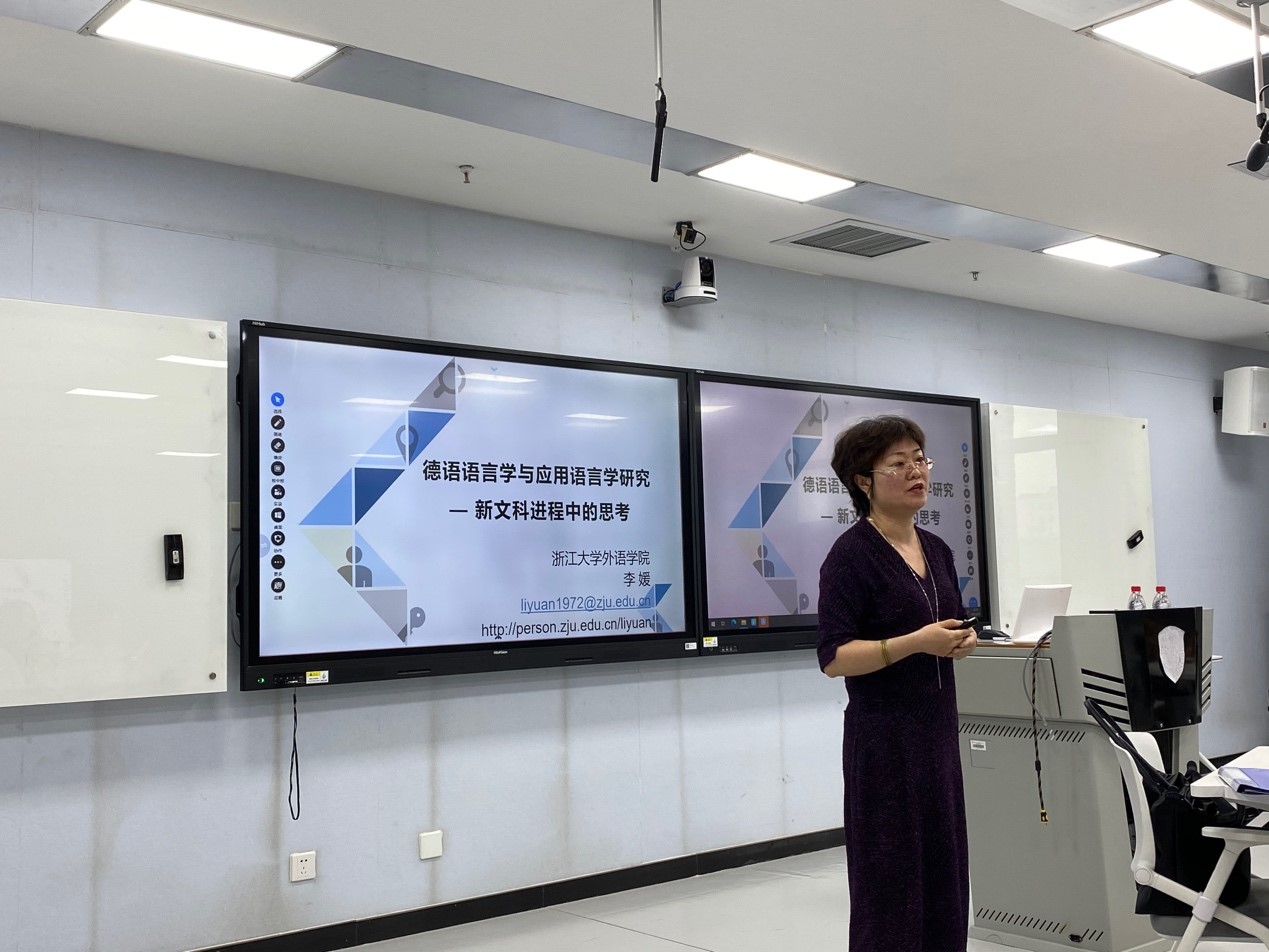 李媛教授以浙江省发布的新文科建设“南山共识”为引,围绕新文科建设进程中的学科发展这一主题,从选题、立场、方法三个维度出发,结合丰富的实证研究案例,介绍了关于德语语言文学学科发展未来方向的思考。李媛教授指出,“新文科”的“新”指的是创新发展,在于科技创新、交叉融合与文化自觉;在选题上,要从学科导向转向需求导向、问题驱动,紧扣时代脉搏,服务国家战略与现实发展需求;在方法上,要具有鲜明的跨学科意识,以更开放的姿态,积极运用各学科领域的方法,促进学科融合发展;在立场上,要坚定中国自信,站稳中国立场,关注本土问题,既要敢于理论创新,也要致力于提升我国理论在国际学术界的可理解度;新文科建设赋予了德语语言文学学科新的时代使命,就是要会讲、讲懂、讲好中国故事。