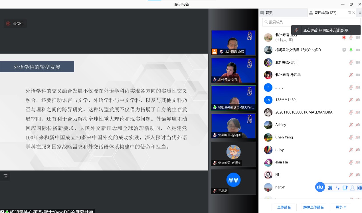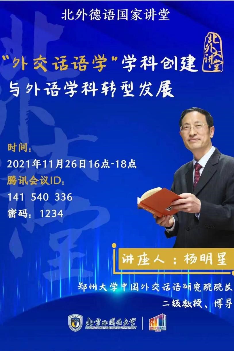 2021年11月26日下午,北外德语国家讲堂以线上方式举行。郑州大学中国外交话语研究院院长杨明星教授应邀作了题为“‘外交话语学’学科创建与外语学科转型发展”的讲座。讲座由欧美性爱