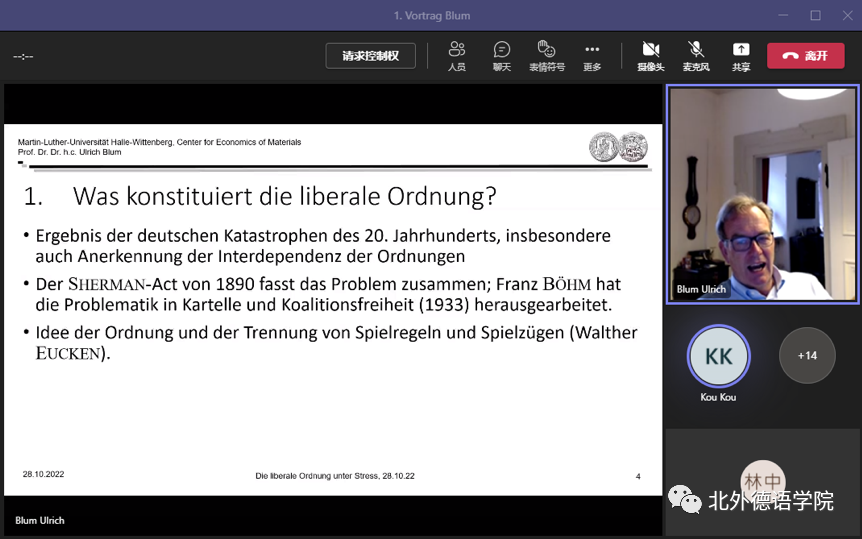 师生线上做了题为“压力下的自由主义经济秩序”的专题讲座。德国经济研究专题讲座由德国经济教研室主办,寇蔻副教授承担了本场讲座的主持工作。