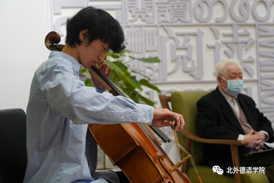 2019级本科生任翊晨深情演奏德国著名音乐家巴赫(Johann Sebastian Bach)作曲的《G大调第一大提琴组曲阿列曼德舞曲》。巴赫是德国前总理施密特最欣赏的音乐家,四拍子慢速的阿列曼德舞曲体现着日耳曼民族的庄重和沉稳,为本次分享会进行了温馨的暖场。