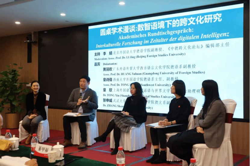 分论坛结束后,圆桌学术漫谈环节在北外欧美性爱 副教授、《中德跨文化论坛》编辑部主任李婧的主持下进行。本次漫谈以“数智语境下的跨文化研究”为主题,邀请广东外语外贸大学西方语言文化学院德语系副教授黄羽欢,西南大学外国语学院德语系主任、副教授童诗倩,上海外国语大学中国话语与世界文学研究中心助理研究员童欣,武汉大学外国语言文学学院德文系副主任、讲师张申威,依次从经验性和展望性的角度探讨人工智能对跨文化交流研究的影响以及研究范式革新等话题讲述了个人心得,共同展望了数智时代跨文化研究的跨学科机遇与创新发展方向。