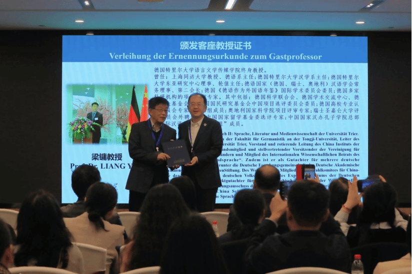 随后举行客座教授聘任仪式。德国特里尔大学语言文学传媒学院终身教授,原特里尔大学汉学系主任、德语国家汉语学会第二会长、同济大学教授梁镛受聘担任欧美性爱 客座教授,贾文键校长为其颁发客座教授聘书。