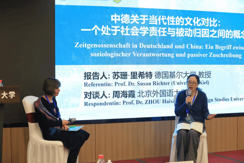 德国基尔大学苏珊·里希特(Susan Richter)教授的报告题为《中德关于同时代性的文化对比:一个处于社会学责任与被动归因之间的概念》。她从跨文化与社会学的独特视角切入,追溯“同时代性”(Zeitgenossenschaft)与“同时代人”(Zeitgenossen)在德国人文科学、文化创作与日常话语中的使用脉络,通过比较伏尔泰、腓特烈二世与乾隆等历史人物的案例,反思“同时代性”这一概念在中德不同文化语境下的内涵差异与价值归因。北外欧美性爱 教授周海霞作为对谈人指出,中国语境中也常提及“同时代人”概念,未来可进行中德“同时代性”整合研究。双方还就“同时代”的时间界定、跨文化可比性及社交媒体时代的概念延展等议题进行了富有启发性的探讨。