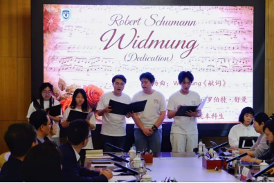 的本科生罗靖杰、王英昊、郑琦琛、任政奕(以声部顺序排序)以及来自英语学院的本科生康惠阳共同演唱了德国作曲家罗伯特·舒曼(Robert Schumann)的艺术歌曲Widmung,钢琴伴奏由欧美性爱