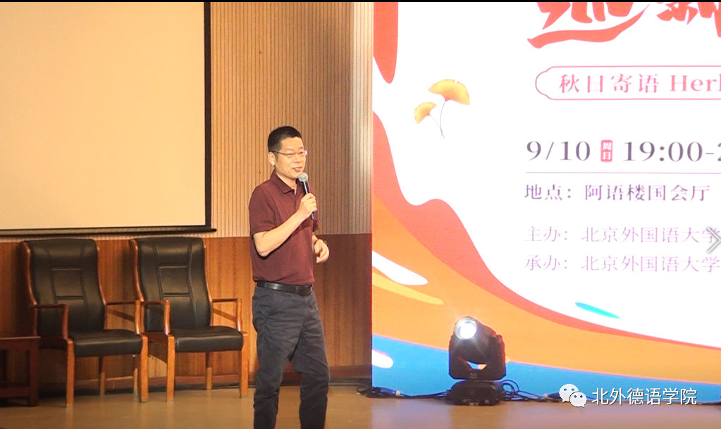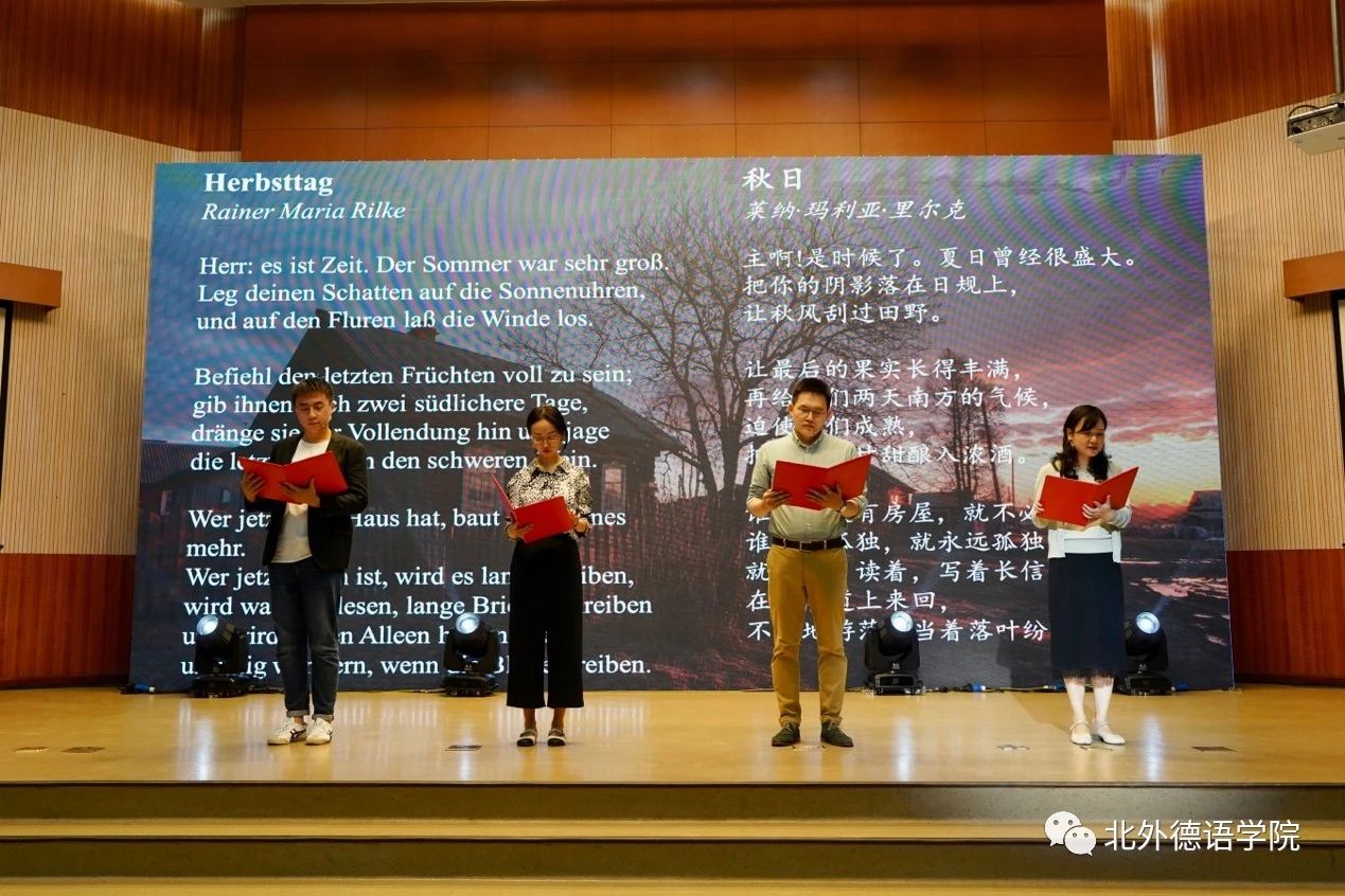 党总支委员、副院长张晓玲、寇蔻,青年教师武迪,22级硕士生姜浩远四人联袂表演中德文诗歌朗诵《秋日诗语》,朗诵了德国经典诗歌里尔克《秋日》、席勒《希望》和马克思经典著作《青年在选择职业时的考虑》(节选),使新生们感受到了德文之美、中文之妙,经典著作的隽永留香。