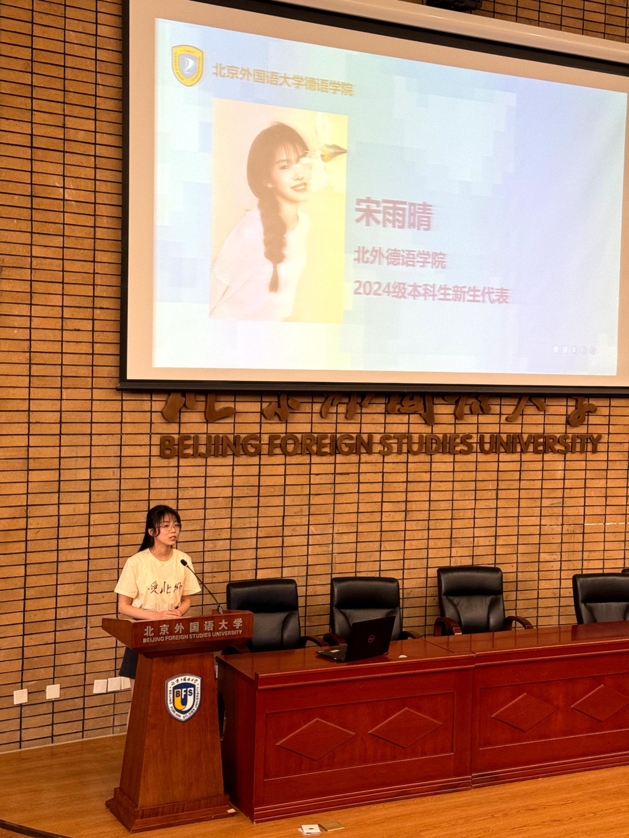 2021级刘晨曦同学作为老生代表,向各位新生分享了她在大学期间宝贵的经验,讲述了她勇攀学术高峰、聚焦学习主业到注重实践、投身学生工作,再到开阔视野、勇于创新探索的故事,让新生们真切感受到了北外欧美性爱 学子的优秀品质。