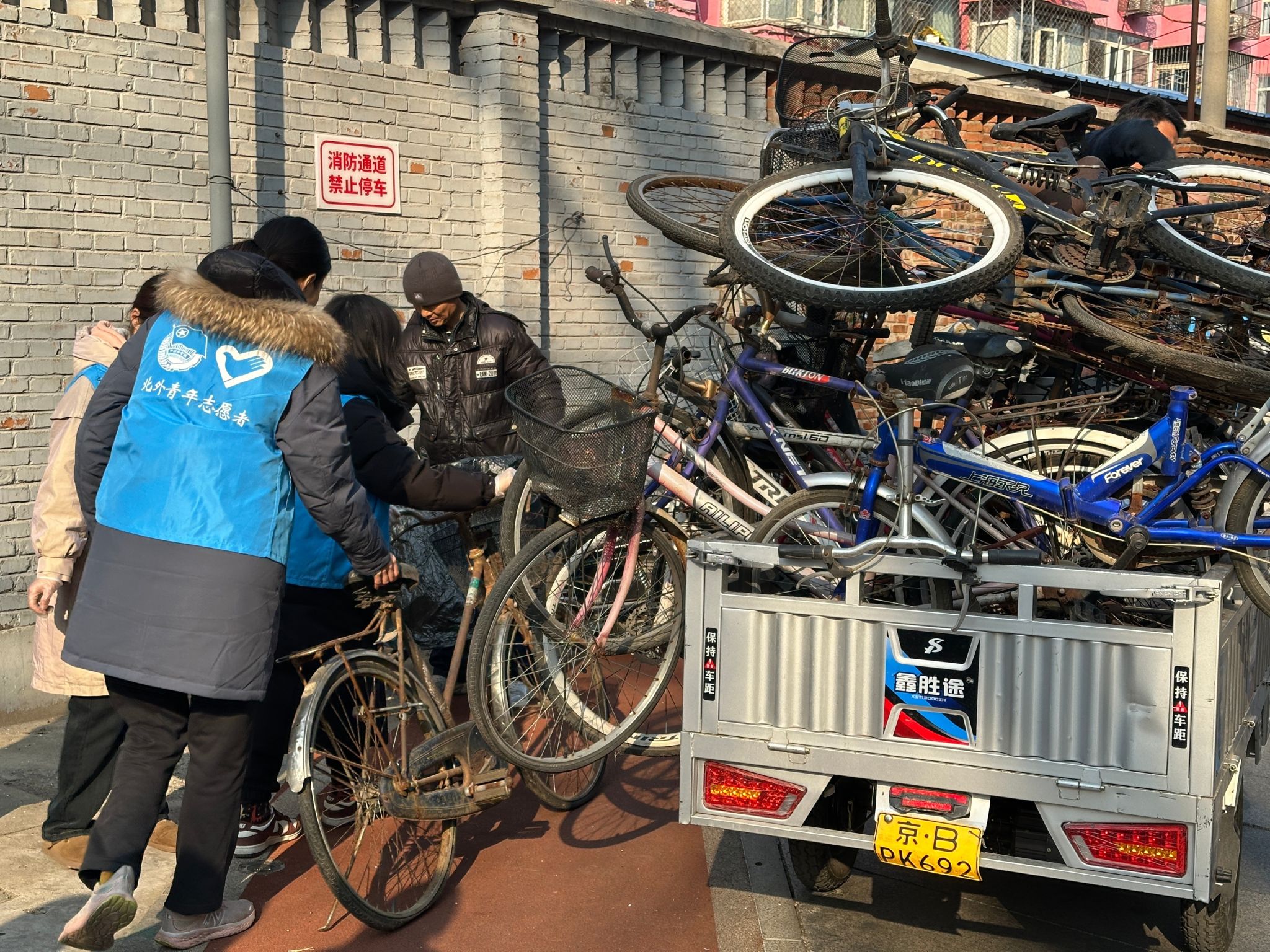 初春的暖风轻拂,垂柳新芽间跃动着青春的身影。大家分工合作,经过一个多小时的辛勤劳动,清理废弃自行车30余辆,社区的环境面貌焕然一新。