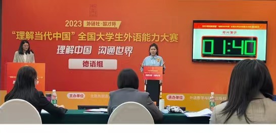 学子积极参与。研究生张佳诺同学和本科生黄婉茹同学入围北京市赛后,勤奋刻苦,认真备赛,最终张佳诺同学凭借出色的发挥晋级多语种组国赛,黄婉茹同学荣获北京市级奖项。多语种组国赛综合考查口译、定题演讲、即兴演讲等能力,第一轮国赛择优晋级,全国各大高校共有十五名选手入围德语组国赛决赛,分别来自中国人民大学、上海交通大学、北京理工大学、浙江大学、青岛大学、华东师范大学、同济大学、武汉大学、西南大学、重庆大学、西南交通大学。经过多轮角逐,张佳诺同学凭借其扎实的翻译基本功、对“讲好中国故事”的深刻理解及其富有感染力的演讲获德语组金奖,并摘得德语组全国冠军的桂冠。