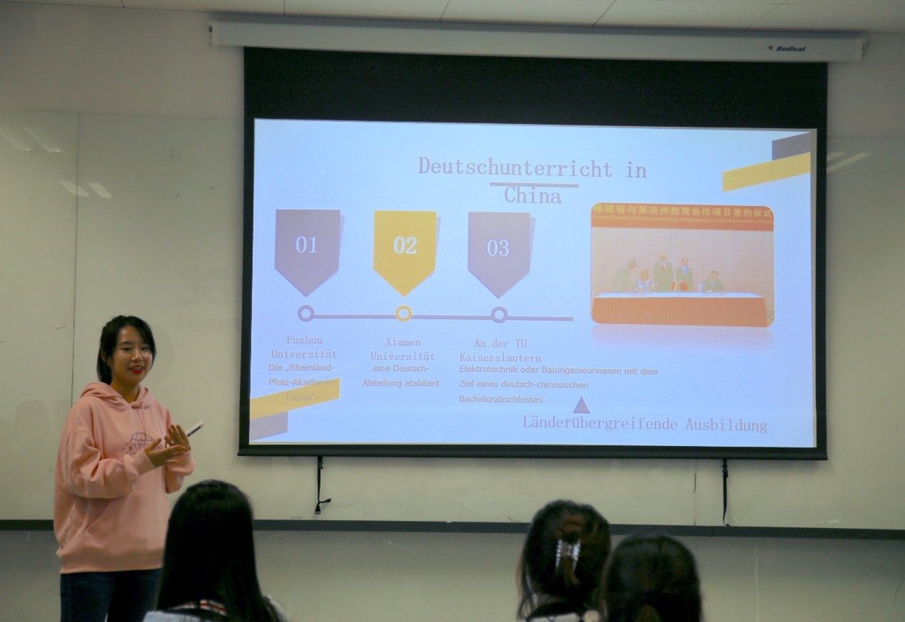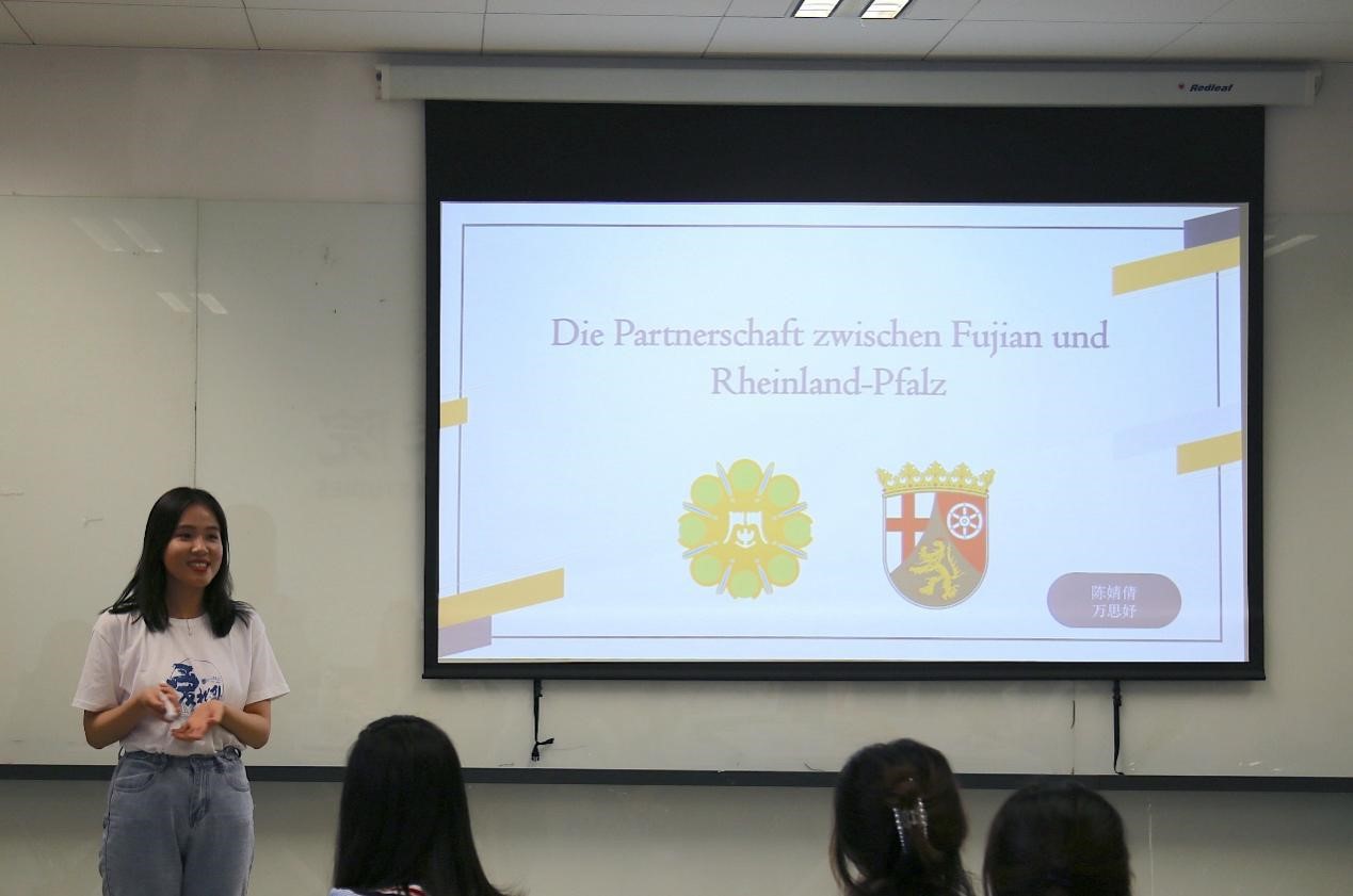 本科生陈婧倩和万思妤以闽南语中“茶”和德语中“Tee”的发音之相似为例开启了对中德交流的讲述,报告以福建省与德国莱法州的交流合作为主题,从经济、教育与科技三个方面介绍了两地三十年来的交流合作,并展望了中德两国未来的发展和合作空间。