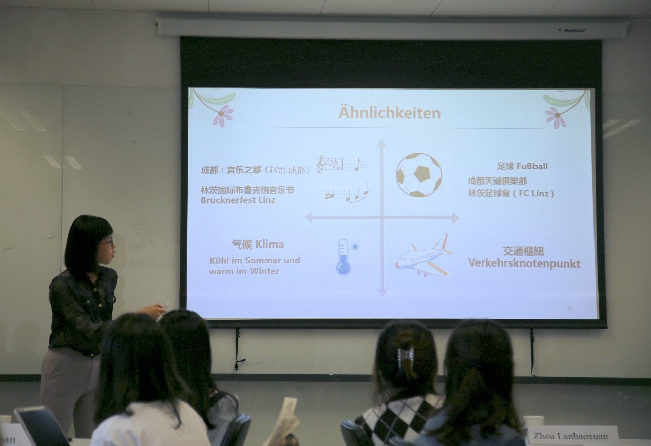 本科生郭沈嘉乐与萧瑀莘(台湾交换生)为大家介绍了“锦城”成都与奥地利著名城市林茨的诸多共同之处,以及两个城市在医疗科技、文化教育等等方面的合作交流。2021年恰逢中奥建交50周年,同学们祝福两国友谊长存,倡议以合作共同应对全球挑战。