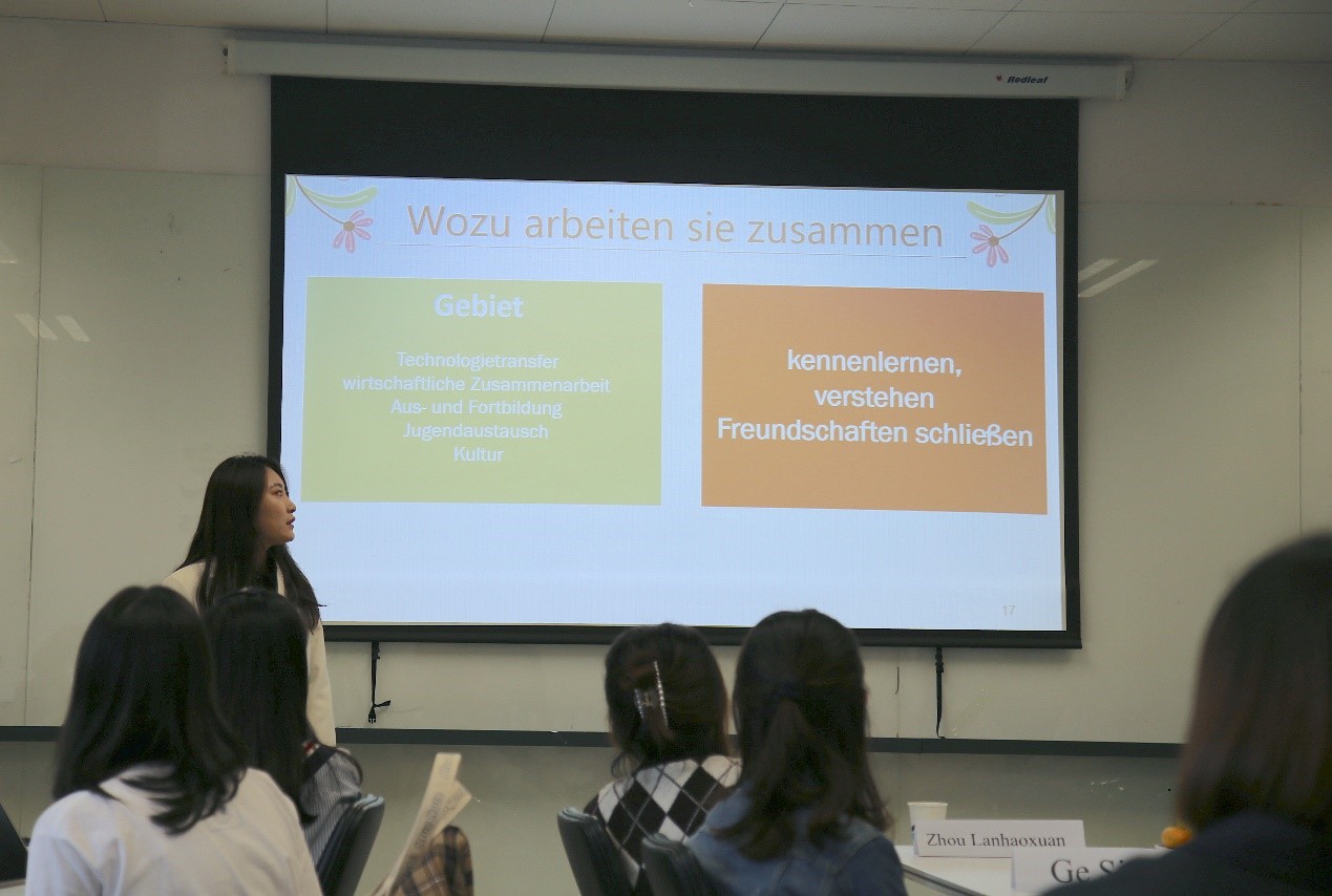 “德语国家概况课程”进行混合式教学的总体设计思路。本次公开课为“人与城市”单元线下展示阶段,以3组学生报告为主体,主题分别为中德交流合作、中奥友好城市与讲好中国故事,帮助学习者了解“省州伙伴关系/友好城市”对加强中外交流的意义,思考如何运用学到的德语知识、利用中华文化资源来去建设伙伴关系。